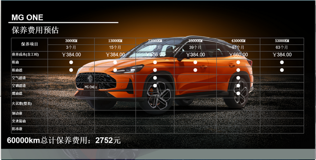 说完了燃油费用和保险费用,那接下来就是保养费用了,对于大部分消费者来说,质保期内肯定是在4S店来保养的,过了质保期有些朋友会选择在其他第三方机构来保养,保养周期的话,MG官方推荐10000公里保养一次,间隔是每10000km,有优势,每次保养也不贵,更换机油机滤加上工时费384元,我们以6万公里为一个周期做计算,6万公里总计需要的保养费用为2752元,按照每年行驶2万公里来计算,需要花费的保养费用是917元。