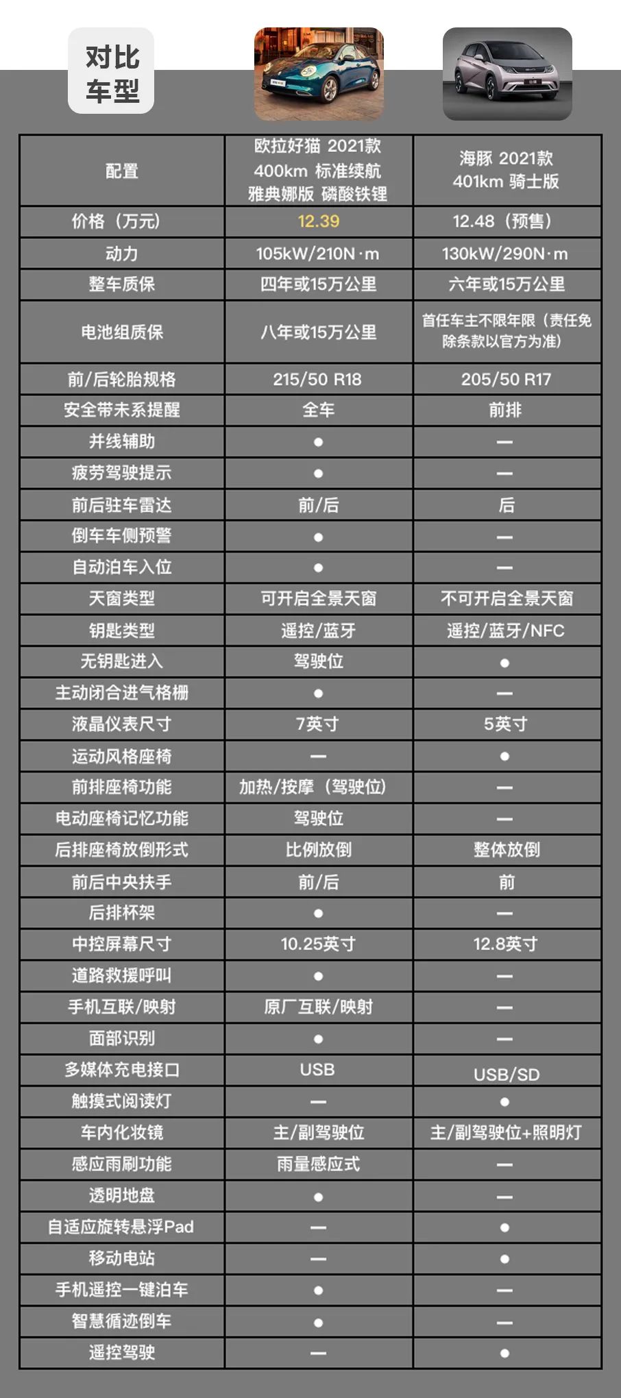 湃客选择了【欧拉好猫 2021款 400km 标准续航 雅典娜版 磷酸铁锂】和【海豚 2021款 401km 骑士版】进行配置对比。欧拉好猫不仅价格更低,而且配置丰富,例如多出了并线辅助、疲劳驾驶提示、倒车车侧预警、自动泊车入位、前排座椅加热/按摩(驾驶位)、原厂互联、透明底盘、智慧循迹倒车等配置。这一系列功能可以大幅优化日常用车的舒适性以及驾驶的便利性。比亚迪海豚同样有值得肯定的优点,例如整车质保以及电池组质保更有诚意,移动电站功能可以让车充当一个“巨型充电宝”,如果进行户外露营等活动,直接解决了电的问题。