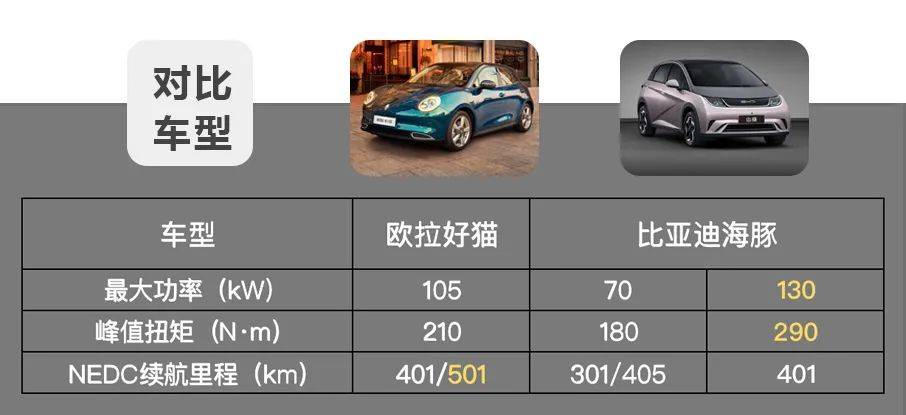 欧拉好猫的最大功率105kW,峰值扭矩210N·m,NEDC续航里程分为401km和501km两个版本。比亚迪海豚70kW版峰值扭矩180N·m,NEDC续航里程分别为301km和405km;130kW版峰值扭矩290N·m,NEDC续航里程为401km。客观来说,欧拉好猫的绝对动力相当于1.4T发动机的水平,对于一台小型车而言,这种动力已经足以应对日常用车需求。另外,欧拉好猫提供了磷酸铁锂和三元锂两种电池包。对于海豚而言,比亚迪多年来在新能源市场打下的市场口碑以及技术积累就是它的先天优势。